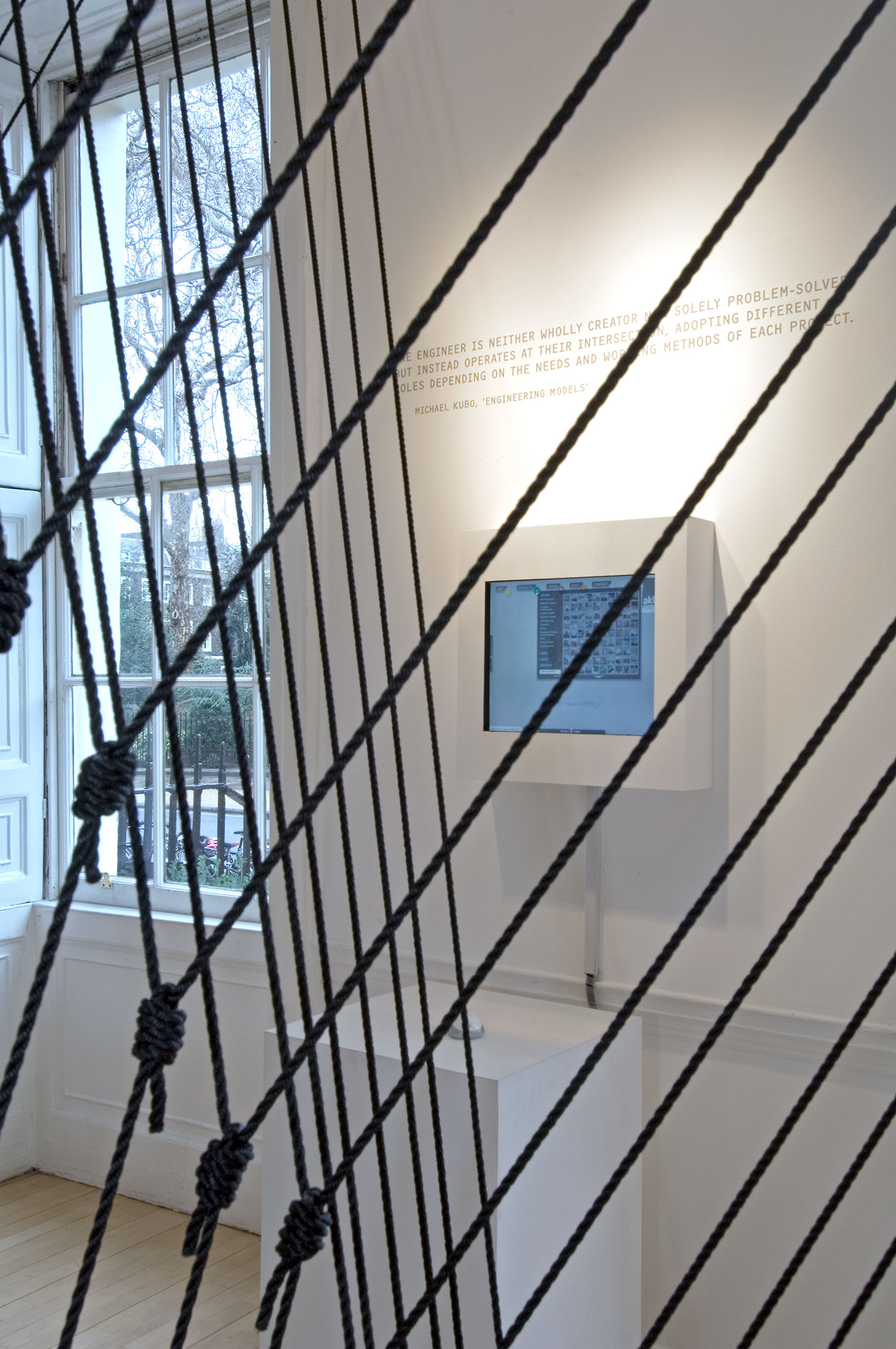 The installation was developed for the first AKT exhibition at the AA Gallery in London. The project represents the inextricable link between structure and form. Understanding form as a diagram of the forces acting upon matter is the departing point to explore structural forms and the form-generating process. The installation is built stretching over 3Km of rope.