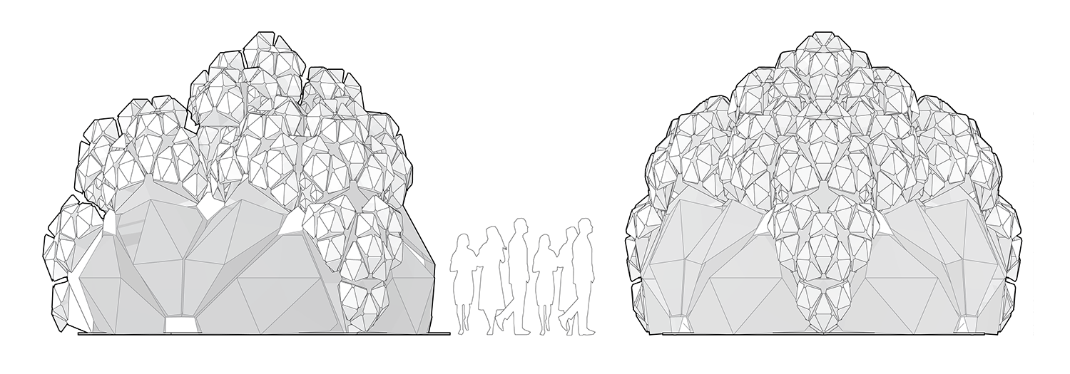 presents a self-supporting structure formed by three arching legs and a central dome. Its recursive geometry produces a fractal pattern.
